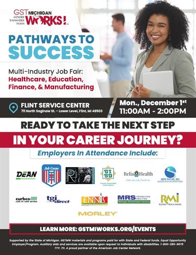 Ready to take the next step in your career journey? Meet employers hiring now in Healthcare, Education, Finance, and Manufacturing at our Pathways to Success Multi-Employer Job Fair on Monday, December 1st, 11 AM – 2 PM at the GST Michigan Works! Flint Service Center.